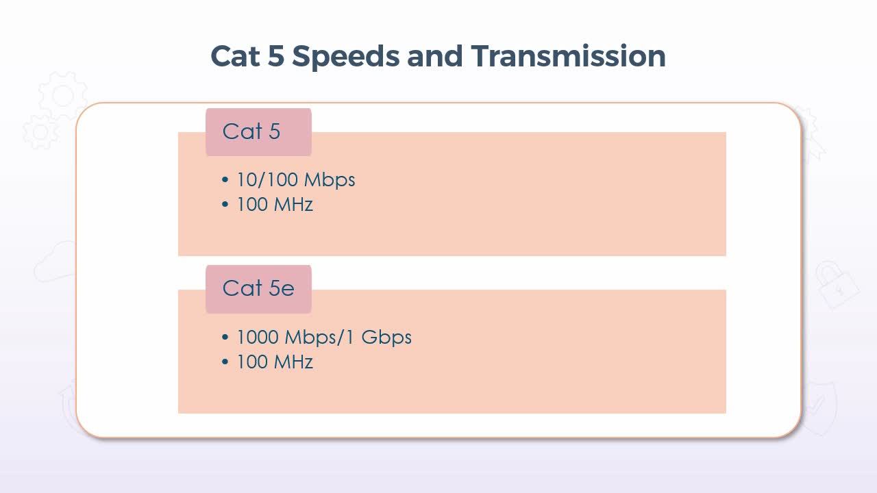 In this video, we'll specifically look at some of the limitations of wired Ethernet standards, including the speeds they can handle and some other considerations. But we'll focus on the most common cable standards at the time of this recording, of category 5, 5e, 6, and 6a. Now, with that, I should point out that category 5 would be quite rare these days, and also category 7 and 8 are available, but, that all said. Beginning with Cat 5 and 5e, 5 was only capable of supporting speeds of either 10 or 100 Mbps and used a transmission frequency of 100 MHz. So, even when compared to 5e, Cat 5 is considered to be quite slow. 5e increased the speed to 1000 Mbps or 1 Gbps, but still used a transmission frequency of 100 MHz.