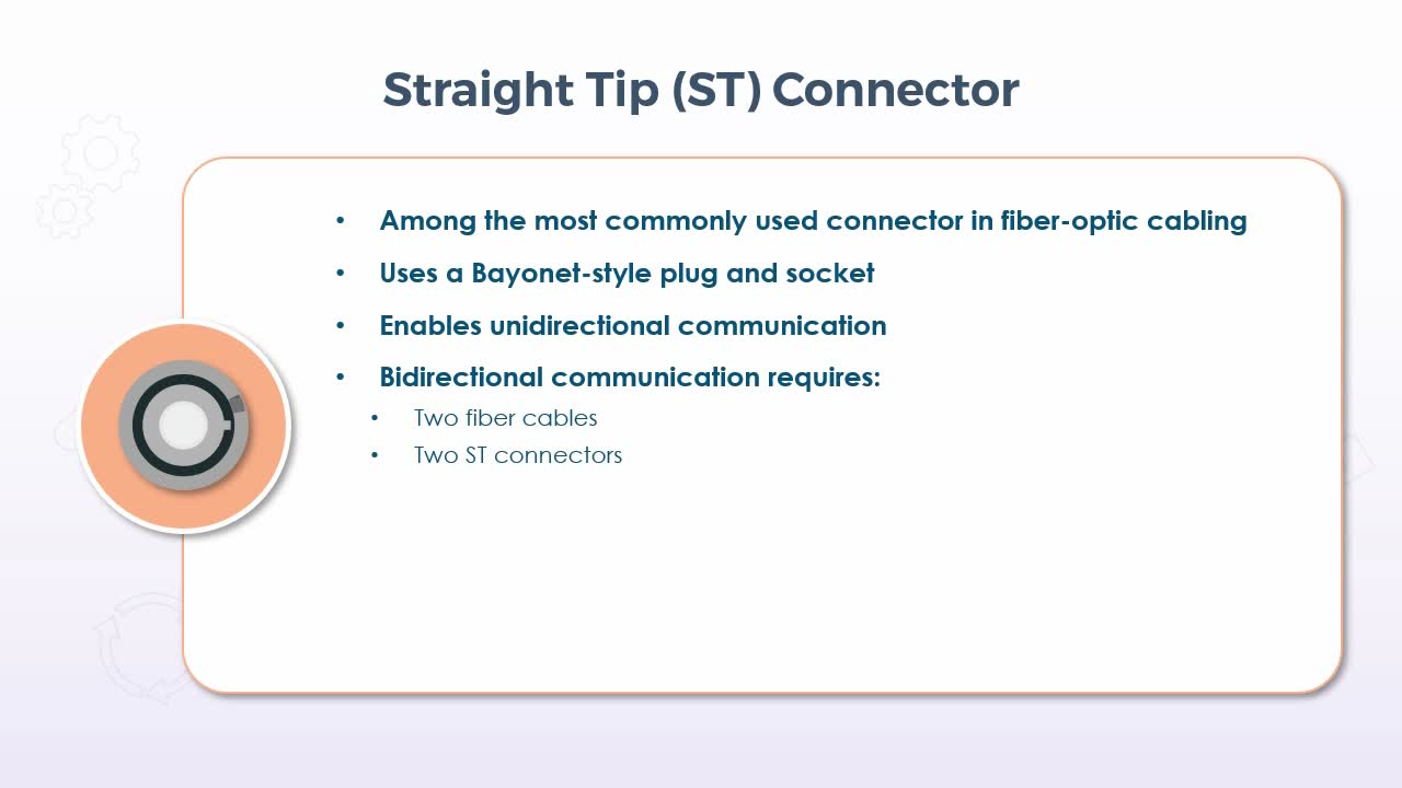 In this presentation, we'll discuss the different types of connectors in use with fiber optic cabling. Beginning with the straight tip or ST connector, which is among the most commonly used type of connector in fiber optics and uses what's known as a Bayonet-style plug and socket, due to the fact that it is inserted then twisted to lock it into place. Now this provides only for unidirectional communication, meaning that for bidirectional communications, two cables and two connectors on each end are required. Now, that said, in many cases each unidirectional cable is still enclosed within a single outer casing, so that from our perspective there is only a single cable, but there would still be two connectors at each end.