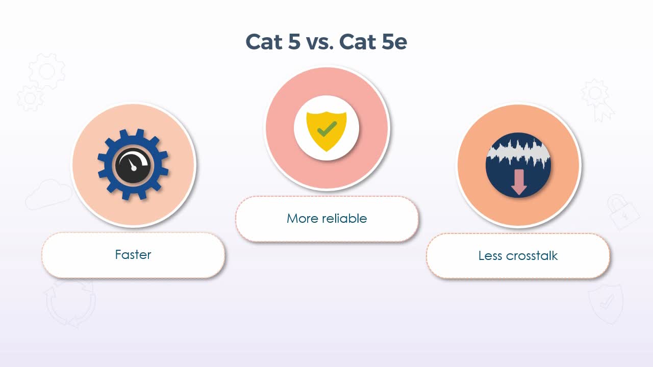 So overall, Cat 5 with its top speed of only 100 megabits per second is not an ideal choice for most environments these days, particularly very large networks with very high bandwidth requirements. It might still be adequate in a home network, and I'd say that if you do encounter it, that would be the more likely location. In its unshielded implementation, Cat 5 is also somewhat prone to electromagnetic interference and crosstalk within the cable itself. So, Cat 5e or enhanced used improved materials to further reduce its susceptibility to interference and crosstalk, even in its unshielded format. But it is moderately more expensive than its predecessor, and that itself would be a very relative statement, because I would say that it's unlikely that you would be able to buy the original Cat 5 cable anymore at all. So, more appropriately at the time when environments were looking to upgrade, it was marginally more expensive.