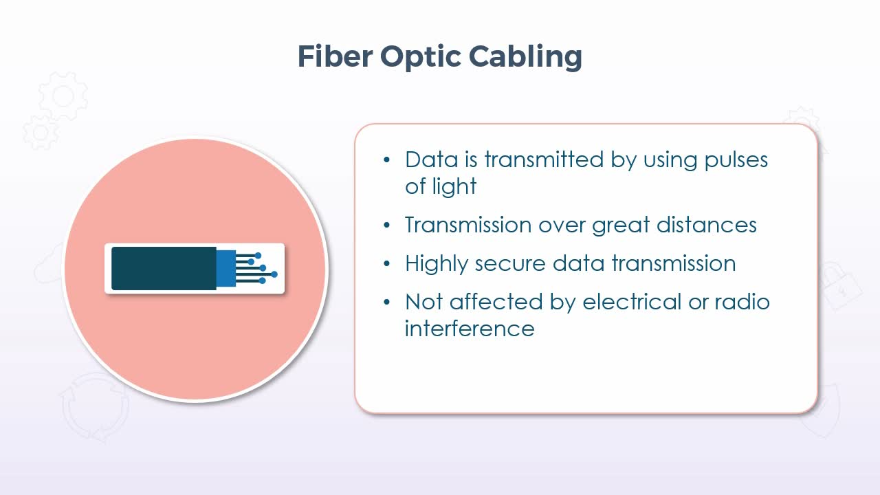 In this presentation, we'll take a look at the basics of fiber optic cabling, which literally transmits data by using pulses of light as opposed to an electromagnetic current over a copper wire. Now this method immediately provides several benefits, including the ability to transmit data over very large distances most notably, because it doesn't suffer from resistance, like a signal on a copper wire does. And because it's just pulses of light, it provides better security than copper wire, because if an intruder has physical access to the cable itself, it is possible to tap into copper wire to intercept data. But if you try to do that with fiber optic cabling, it would just break the core material and you wouldn't be able to pick up on anything. In addition, for all practical purposes, it doesn't suffer from electromagnetic interference from sources, such as power generators or strong radio emissions.