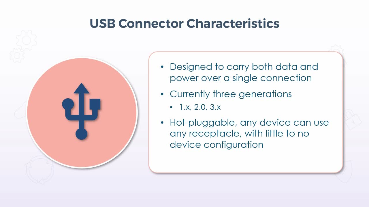 In this video, we'll examine some of the characteristics for the various types of connectors in use with USB cabling. Now, for starters, USB itself is designed to carry both data and power over a single connection, and there are currently three generations which effectively are 1, 2, and 3. But both 1 and 3 have subcategories, if you will, which is indicated by the .x. Now all USB devices are hot-pluggable, meaning that any device can use any receptacle, with little to no device configuration and nothing has to be powered down and/or rebooted. You can plug the device in, and it really should be detected immediately and again in most cases configured automatically.