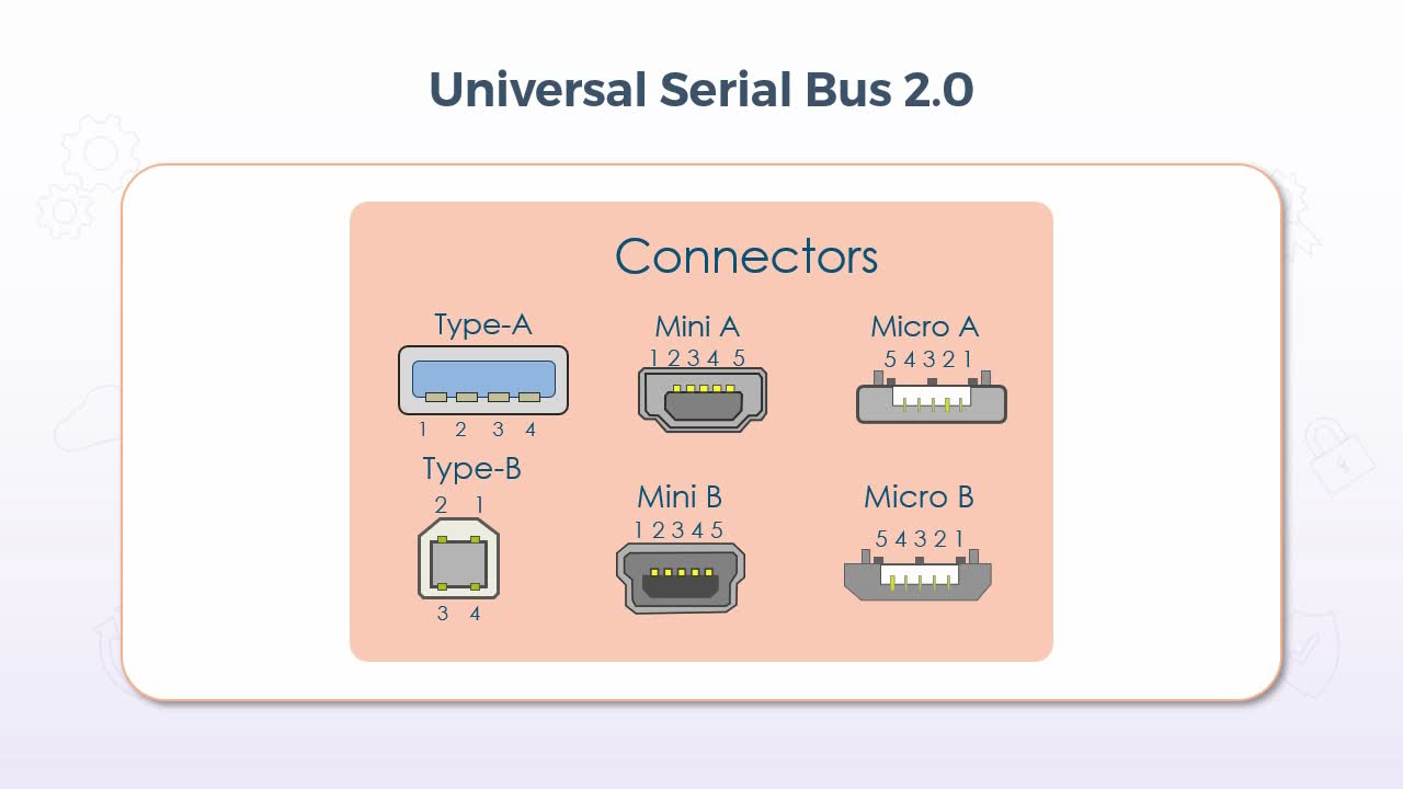[Video description begins] A slide titled Universal Serial Bus 2.0 appears. It displays different types of connectors, namely, Type A, Type B, Mini A, Mini B, Micro A, and Micro B. The Type A connector has 4 pins labeled 1, 2, 3, 4 which are built at the bottom of the connector. Type B connector contains two pins 1 and 2 at the top and 2 pins, 3 and 4 at the bottom. The Mini A and Mini B connectors have 5 pins labeled 1, 2, 3, 4, 5 which are built at the top of the connectors. Similarly, Micro A and Micro B connectors contain 5 pins labeled 5, 4, 3, 2, and 1. They are shown at the top of the connectors. [Video description ends]