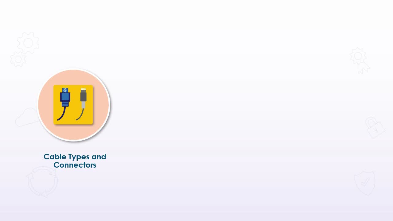 So, in this course, we've examined how to understand basic cable types and their connectors, features, and purposes. We did this by exploring Ethernet cable types and fiber optic cabling, speed and transmission limitations, and T568A and T568B wiring standards. Video, USB, peripheral, and hard drive cables. Common adapters, USB, and fiber optic connector types. RJ-11 and RJ-45 connectors and punch down blocks. DB-9, lightning ports, F connectors, and Molex connectors. In our next course, we'll move on to explore how to recognize, how to install the appropriate type of RAM and storage devices.