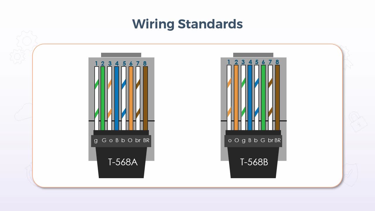 [Video description begins] A slide titled Wiring Standards appears. It displays two types of cable samples: T-568A and T-568B. Both the cables contain a pattern of 8 coloured wires. The T-568A cable has the following pattern: wire 1 is 'g', wire 2 is 'G', wire 3 is 'o', wire 4 is 'B', wire 5 is 'b', wire 6 is 'O', wire 7 is 'br', and wire 8 is 'BR'. The cable T-568B has the following pattern: wire 1 is 'o', wire 2 is 'O', wire 3 is 'g', wire 4 is 'B', wire 5 is 'b', wire 6 is 'G', wire 7 is 'br', and wire 8 is 'BR'. [Video description ends]