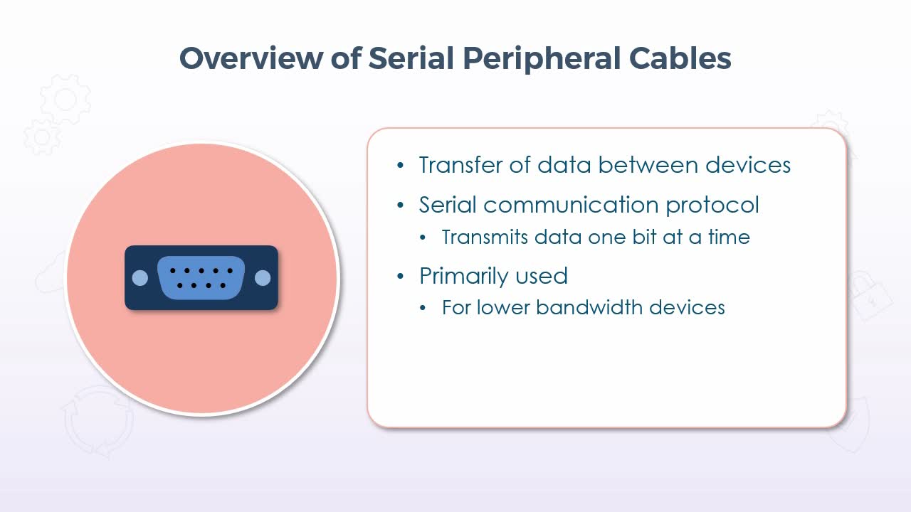 In this video, we'll discuss serial peripheral cable types as well as a much newer type, the Thunderbolt cable. Now these two types would effectively be at opposite ends of the scale in terms of performance, most notably because most types of serial cables are very outdated, but you may still see them being used for specific types of equipment, but that said, the traditional serial cable is, of course, used to transfer data between a peripheral device and a host computer, and they draw the name serial from the fact that they transfer data one bit at a time.
